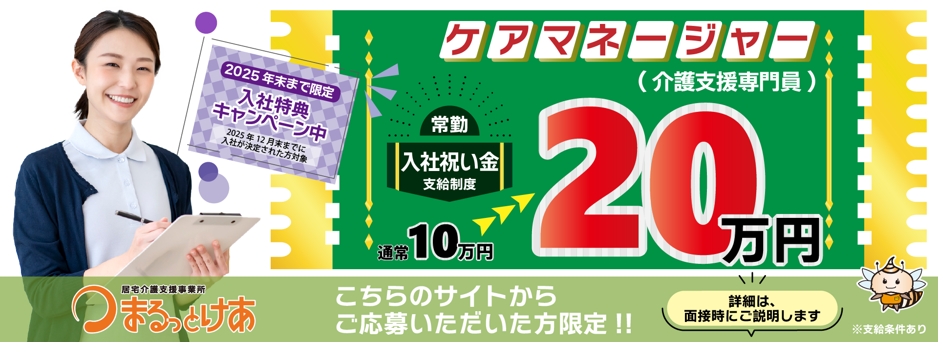 採用となった【常勤】ケアマネージャーさんには、当社規定により入社祝い金として、20万円を支給します。